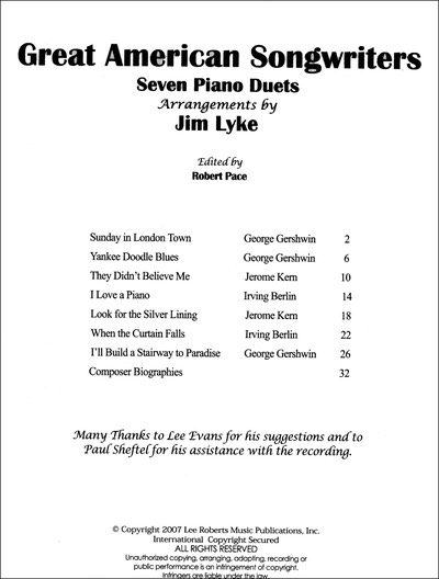 Seven duet arrangements of songs by immortals George Gershwin, Jerome Kern, and Irving Berlin. Composer Biographies included.